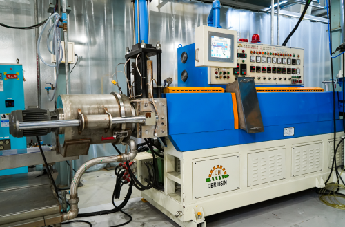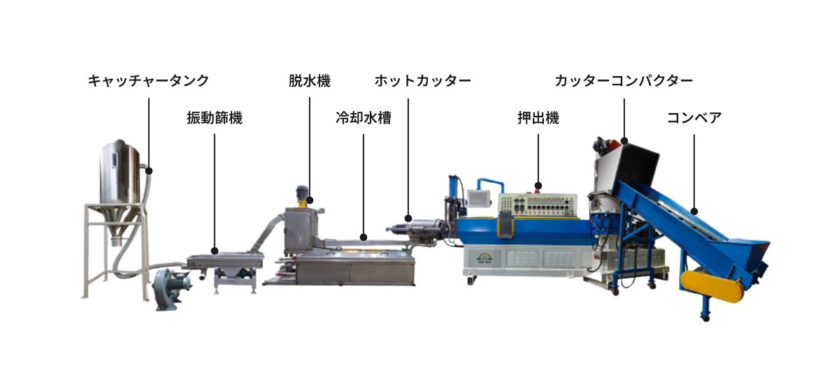 造粒機へ送られてた材料は、スクリューで混錬・押し出されます。スクリーンメッシュで異物を除去した後、ホットカット方式でペレット状に成形されます。