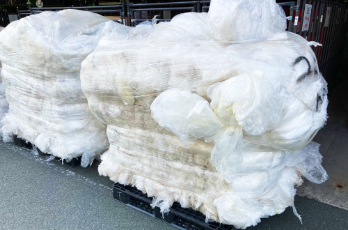 poolによる出自管理のもと、百貨店やアパレル店舗から回収された服飾フィルムが搬入されます。原料は「ベール」と呼ばれる圧縮された状態で届けられます。