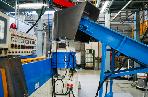 コンベアで運ばれた材料は、カッターコンパクターで細かく裁断されます。高速回転する刃物により破砕されながら、徐々に溶融し、造粒機本体へと送られます。